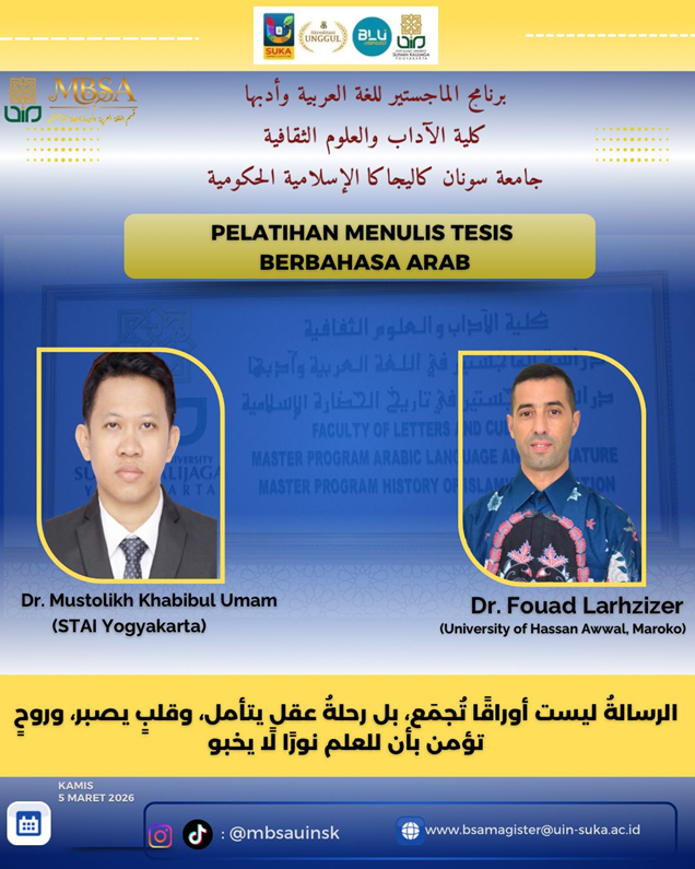 Melalui pelatihan ini, para mahasiswa diharapkan mampu menghasilkan karya ilmiah berkualitas serta memiliki kemampuan menulis tesis berbahasa Arab secara lebih terarah, metodologis, dan sesuai standar akademik perguruan tinggi.